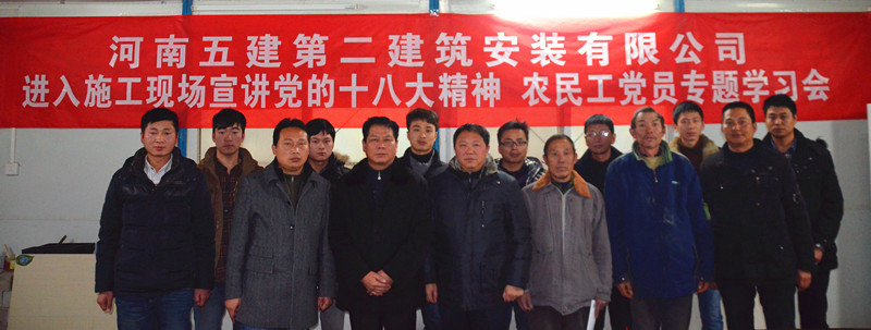 为了迅速掀起学习宣传贯彻党的十八大精神新高潮,公司党委在公司二楼会议室组织召开了贯彻学习党的十八大宣讲大会。随后又在公司金融信访大厦项目部组织召开了十八大精神进入施工现场,农民工党员专题学习会,并邀请市住建局机关党委吴祖启书记为党员同志交流学习十八大精神的经验。
