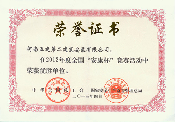 近日,全国安康杯组委会下发中华全国总工会、国家安全生产监督管理总局对2012年度全国“安康杯”竞赛先进集体和优秀个人进行了通报表彰,公司再次获得全国“安康杯”竞赛优胜单位称号。
