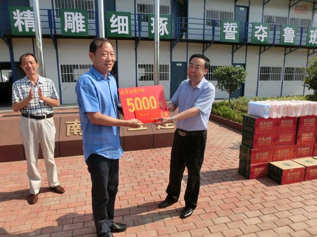 入夏以来,骄阳似火,酷热难耐,持续的高温笼罩着信阳大地,炎炎烈日下,公司各项目一线员工依然坚守岗位。近日,信阳市总工会副主席罗文耀、石磊等领导来到我公司圣德医院项目部慰问施工现场的工人们,并为他们带来矿泉水、毛巾等防暑降温物品以及5000元慰问金,在炎热的夏日为他们送去丝丝清凉。