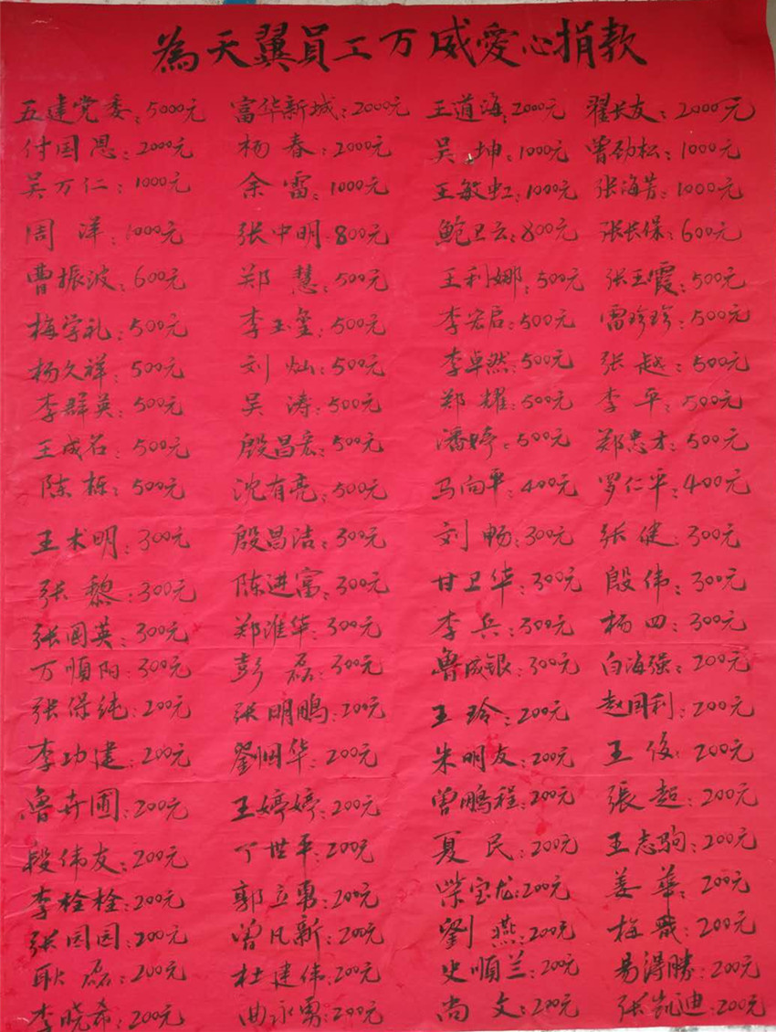滴水成河,真情凝成爱的纽带。份份捐款凝聚着浓浓的深情,涌动着五建人的大爱。万威同志目前已战胜病魔,进入了康复期。