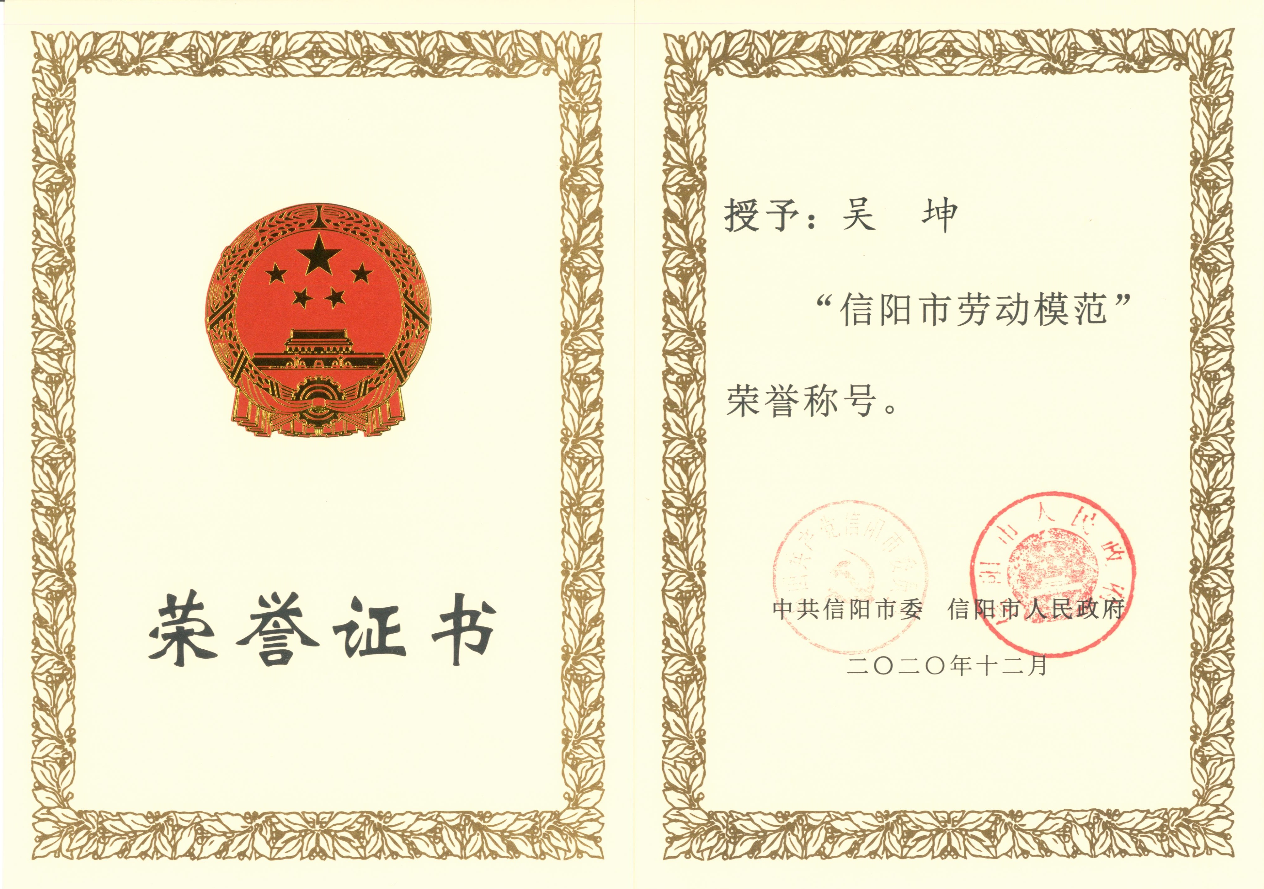 热烈祝贺吴坤同志荣获信阳市劳动模范称号