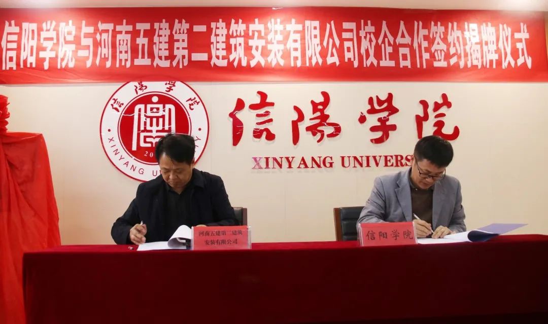 在热烈的氛围下,吴建功和杨高伟共同签订了河南五建二公司与信阳学院校企合作协议书。杨高伟、郭二军、谭笑非、吴建功共同为“实践教学基地”“人才培养及项目研发基地”揭牌,双方领导亲切合影留念。