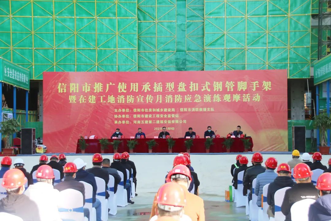 11月9日,在第三十个全国消防安全宣传教育日来临之际,公司第七项目部承建的太古·湖畔樾山项目迎来尊贵的客人,信阳市推广使用承插型盘扣式钢管脚手架现场观摩会暨消防应急演练活动在项目现场隆重举行。信阳市住建局党组副书记、副局长张奔、安监站站长马其峰、副站长杨传臣、信阳市消防救援支队副队长王伟等领导亲临活动现场,公司党委书记、董事长吴万仁受邀出席活动并讲话。整场活动由会议阶段、演练阶段和观摩阶段三部分组成,由安监站站长马其峰负责主持。