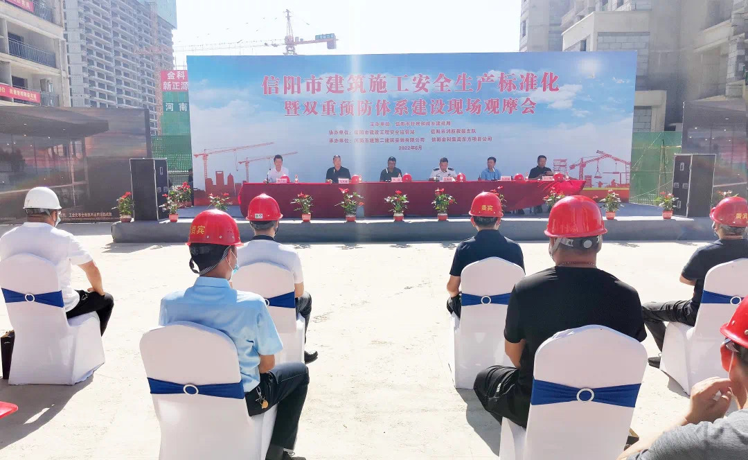为深入开展全国第21个“安全生产月”活动,提高工程施工安全标准化水平,推进双重预防体系建设工作,6月16日上午,信阳市建筑工程安全生产标准化暨双重预防体系现场观摩会在我公司金科集美东方项目现场隆重举行。市住建局党组成员、总规划师张立、市消防救援支队副支队长王秀春、建管科科长陈志国、安监站站长马其峰及高新区住建局局长张彦伟等领导参加活动。公司党委书记、董事长、总经理吴万仁受邀出席活动并讲话。整场活动由会议阶段、演练阶段和观摩阶段三部分组成,由安监站站长马其峰负责主持。