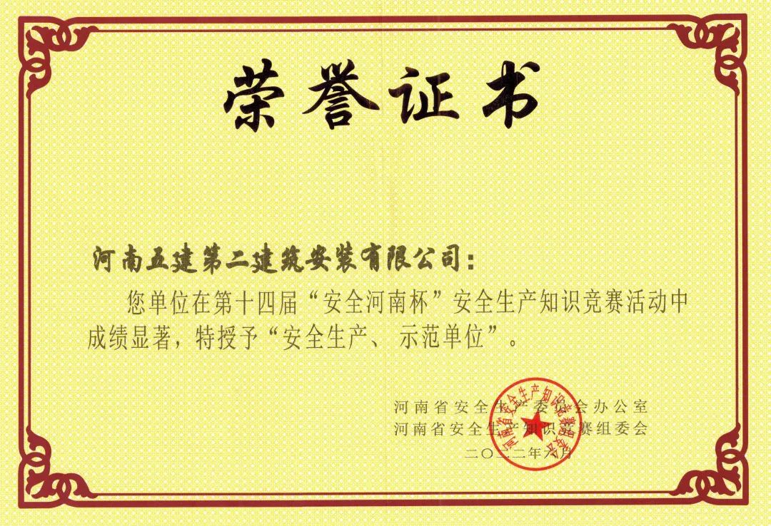 功夫不负有心人,在公司领导和全体项目员工的努力下,我们在安全生产工作上再创佳绩,彰显了我单位安全管理人员工作认真和专业知识的扎实。公司在河南省安全生产委员会开展的第十四届“安全河南杯”安全生产知识竞赛中荣获安全生产示范单位。在河南省建筑业协会开展的河南省建筑施工安全生产知识竞赛活动,并取得了优秀组织单位,公司工程部刘培望同志取得个人三等奖佳绩。